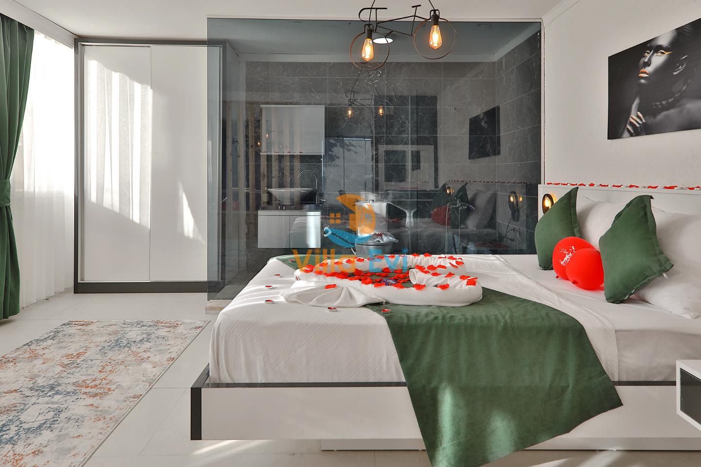Çift kişilik yatak, Jakuzi, Klima, Elbise dolabı ve Modern dekorasyon