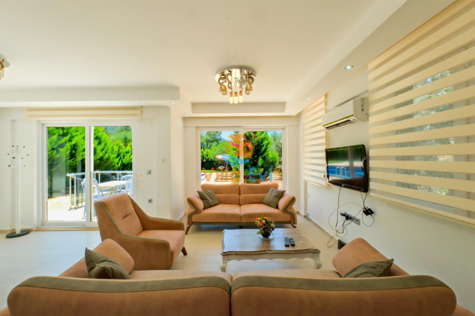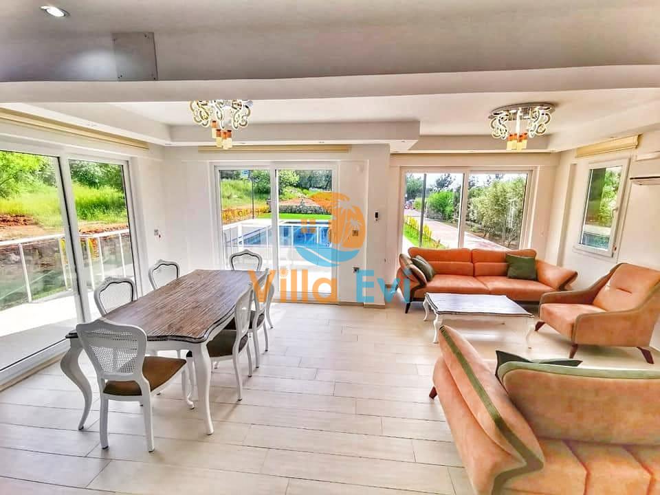 Salon: Açık plan şık bir salon, klima ve direkt havuza geçiş imkanı.