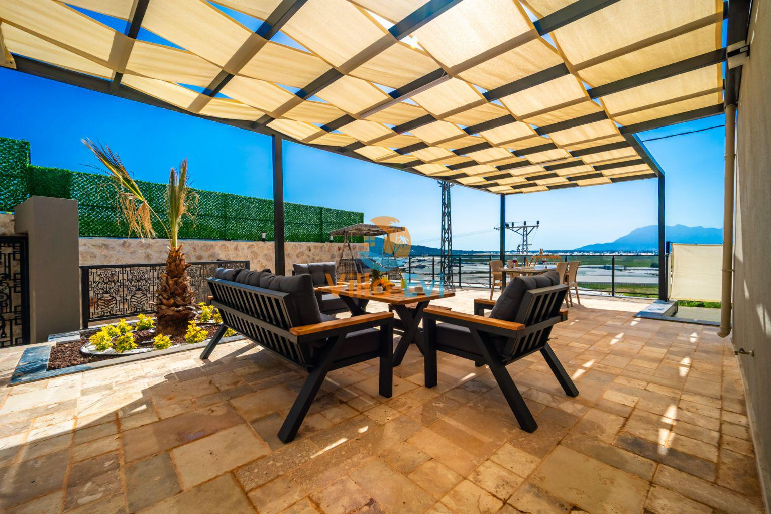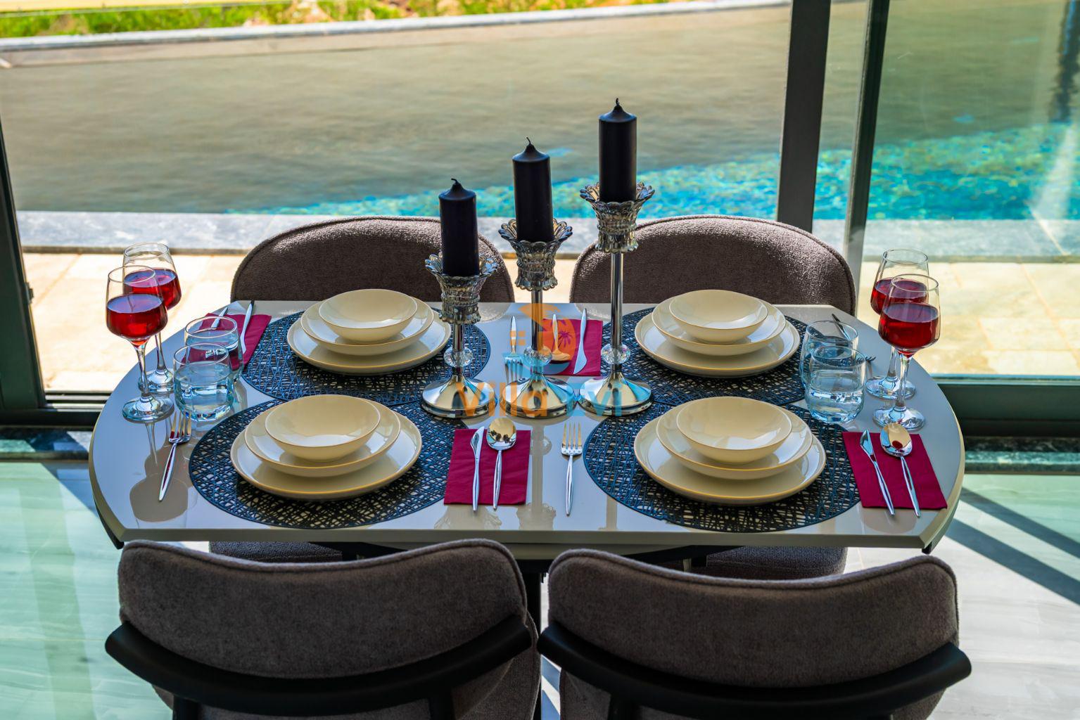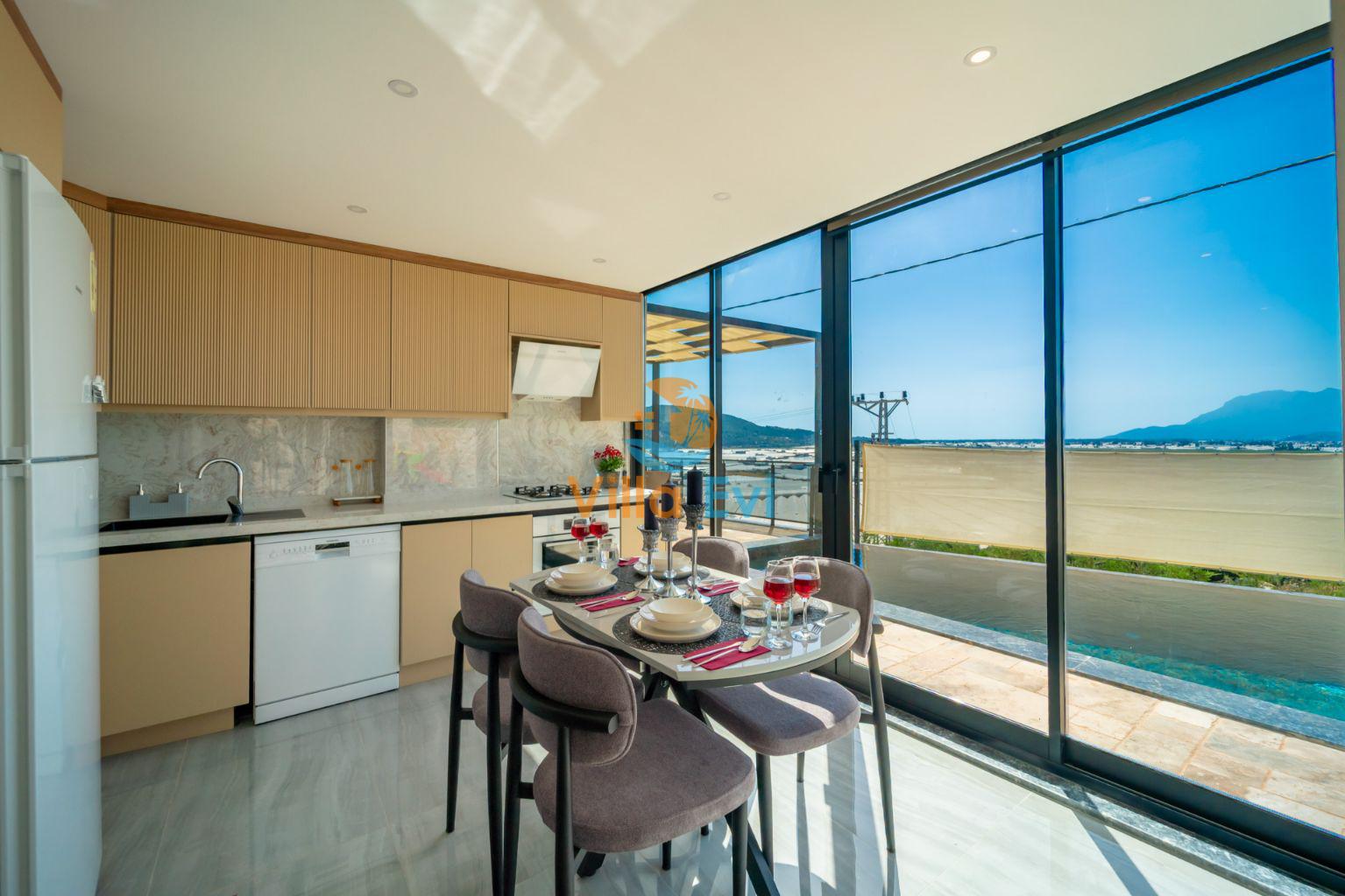 Deniz ve doğa manzarası, Modern oturma grubu, TV, Uydu alıcısı, İnternet modem, 4 kişilik yemek masası & sandalyeler ve Havuz katından direkt havuz erişimi