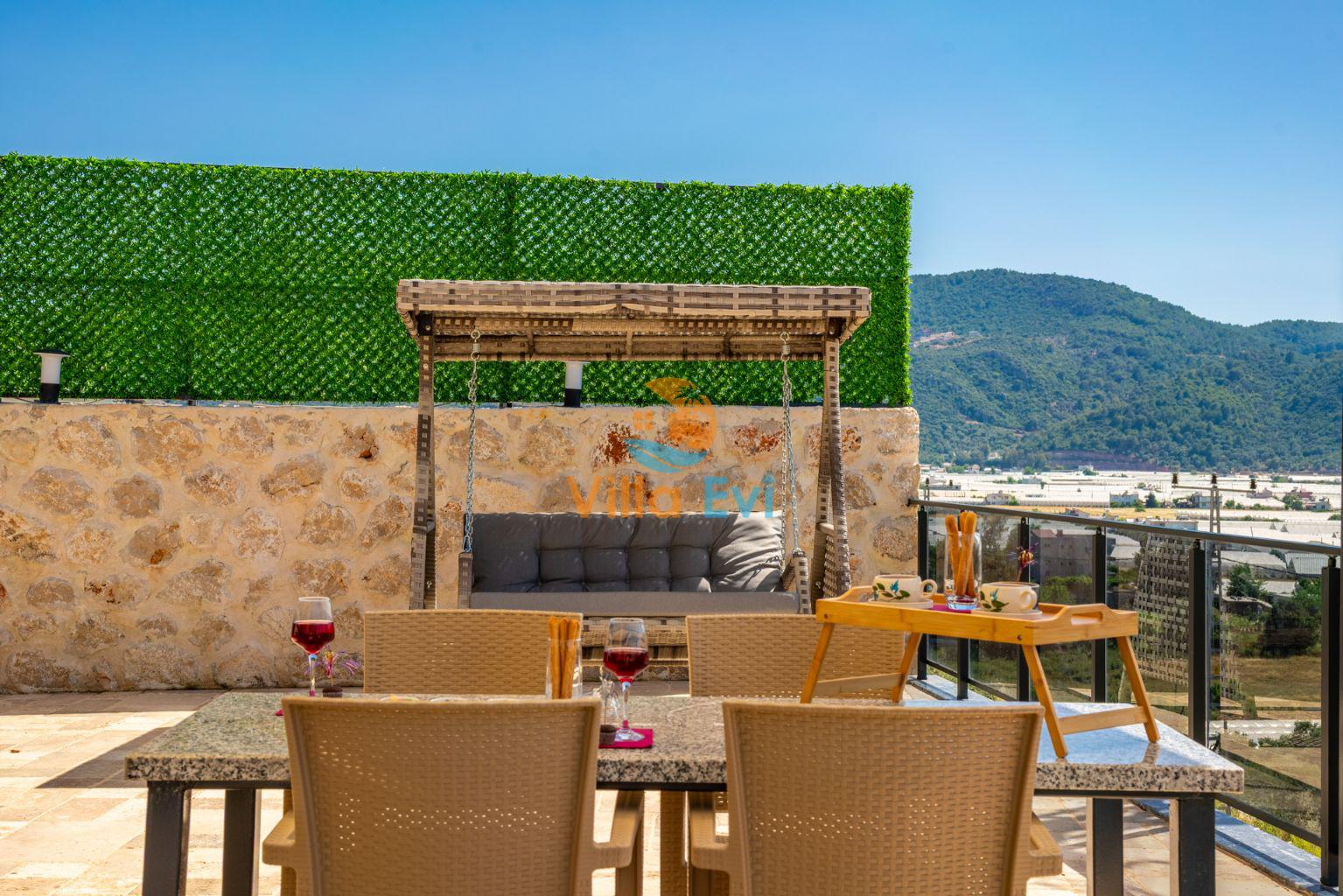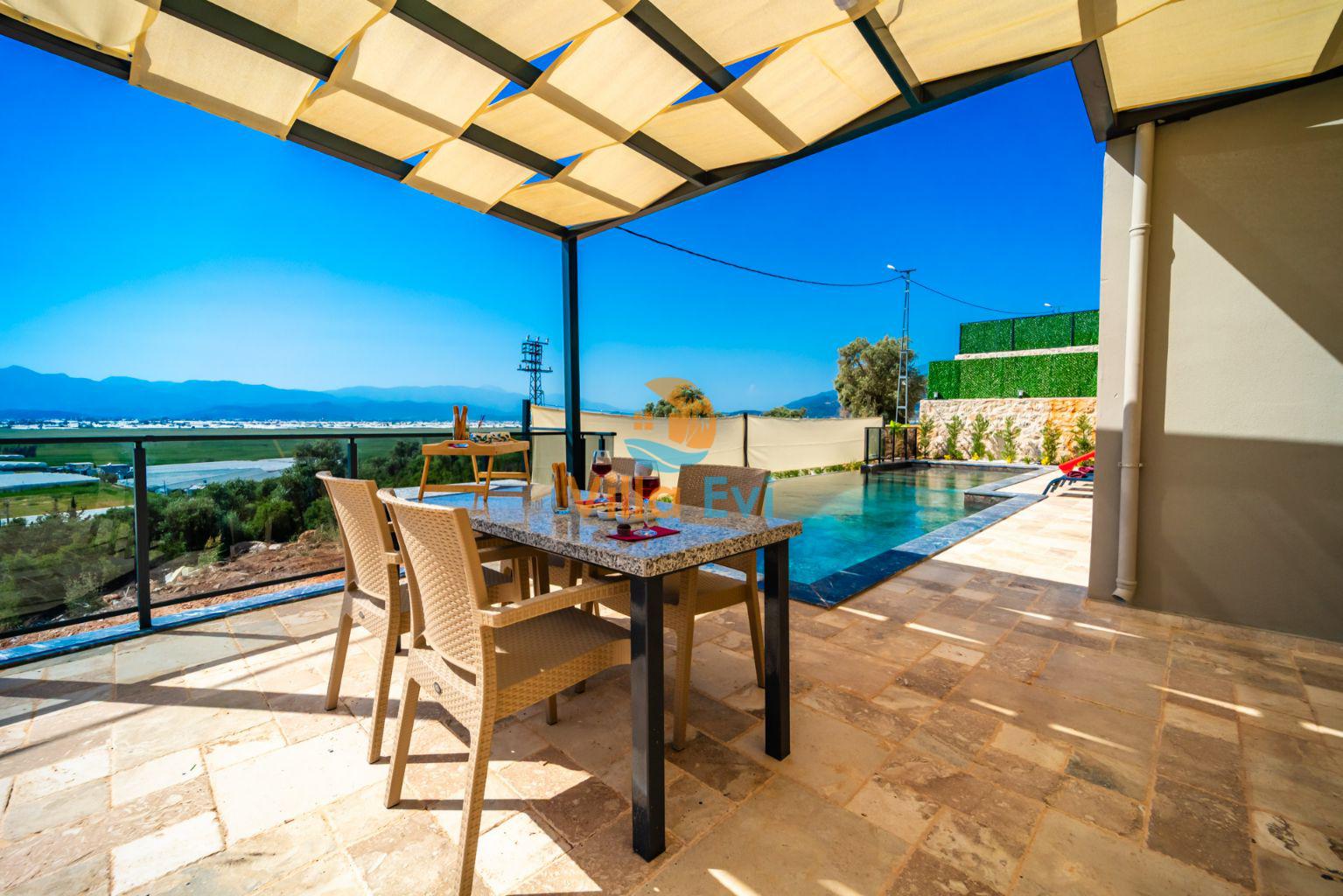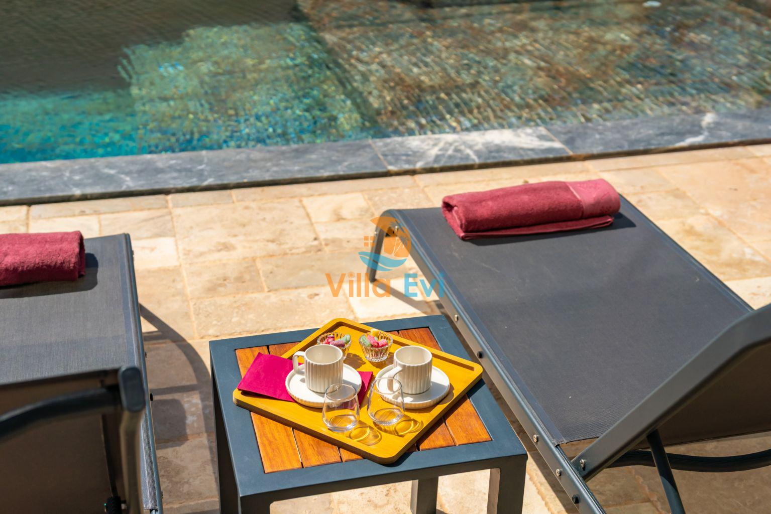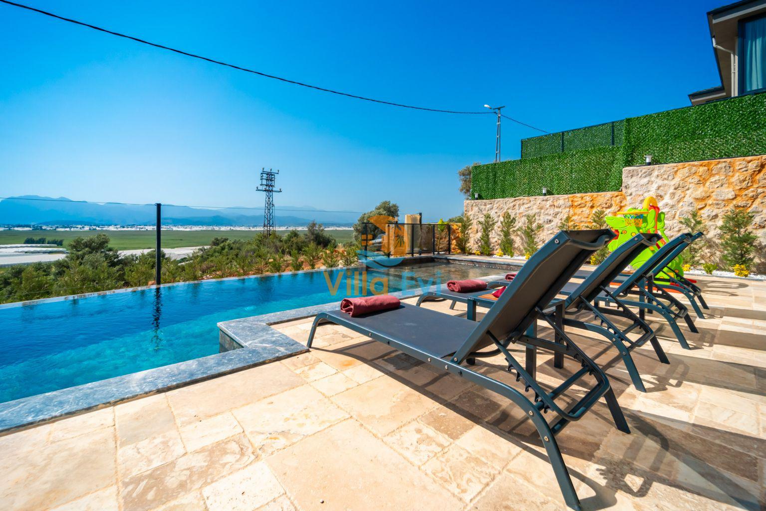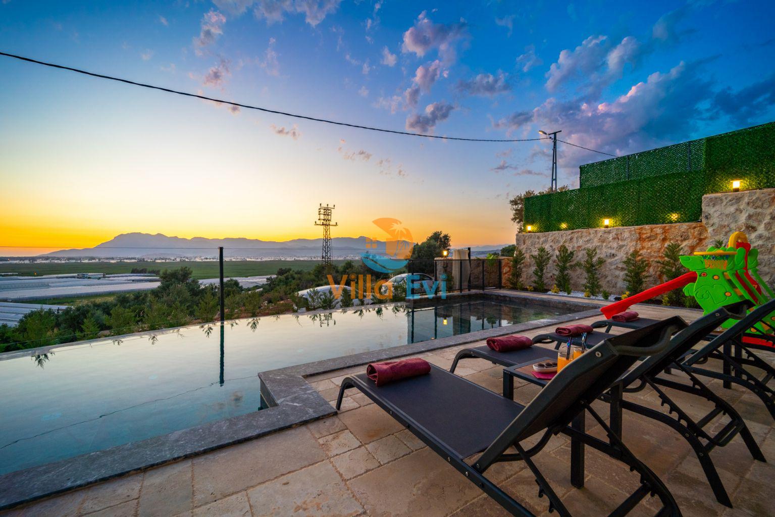 Korunaklı havuz yapısı sayesinde muhafazakâr ailelere uygun olup, dışarıdan görünmeyen özel havuz alanı ile güvenli bir villa kiralama deneyimi sunar.