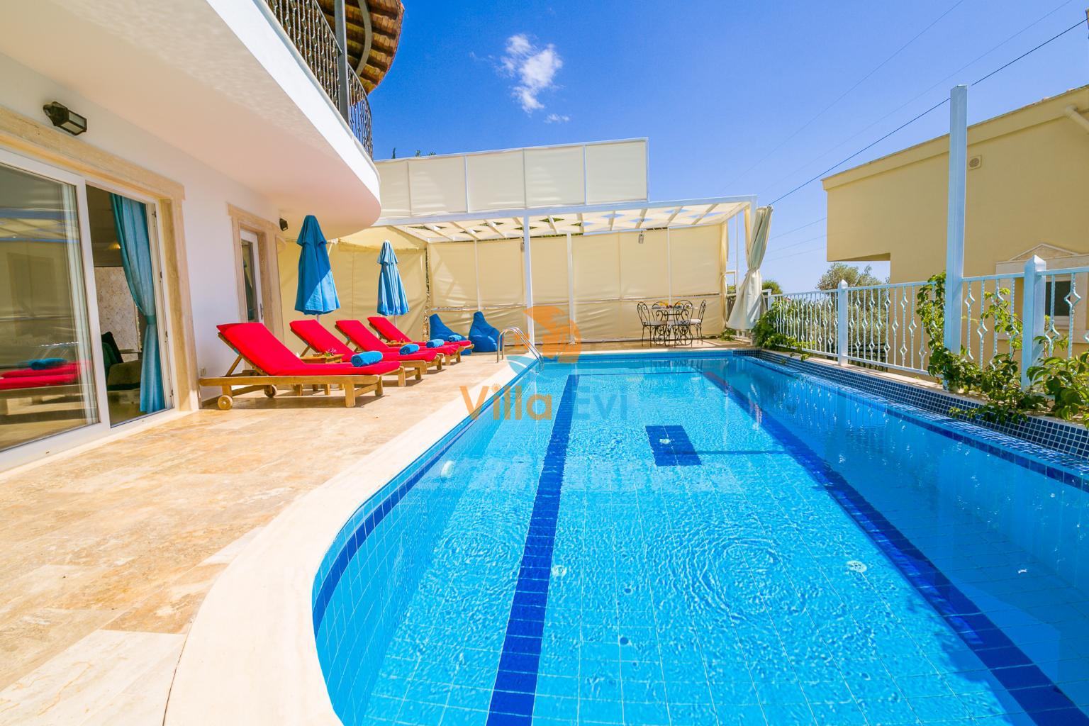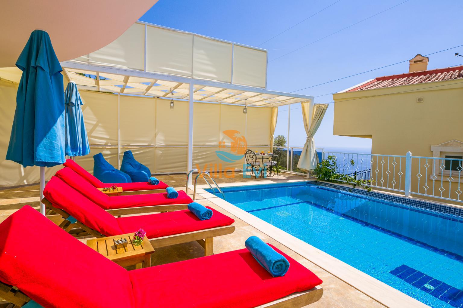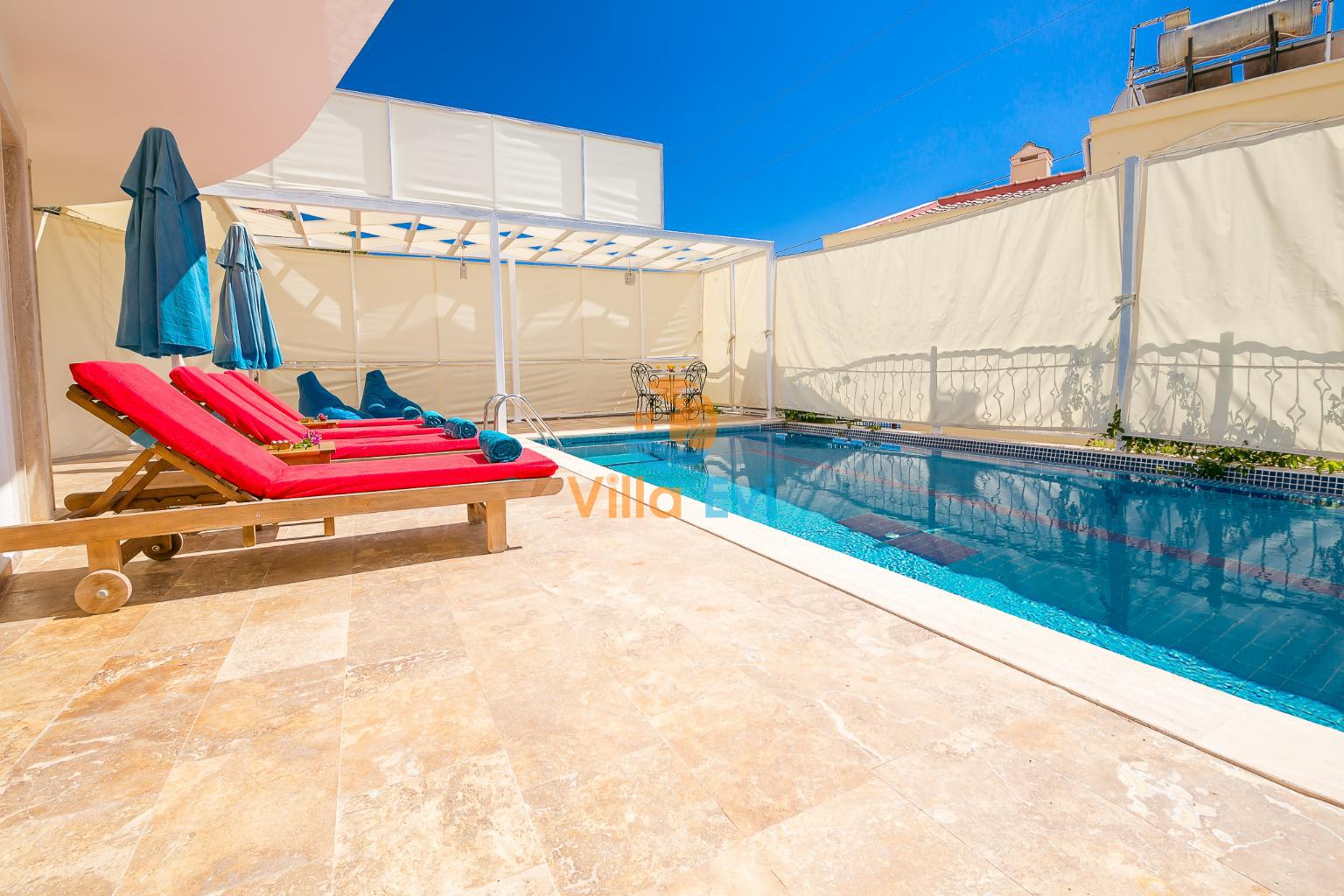 Villanın en dikkat çekici özelliklerinden biri, deniz manzarasına hâkim korunaklı özel havuz alanıdır. Havuz çevresi dışarıdan görünmeyecek şekilde tasarlanmış olup, mahremiyetine önem veren misafirler için idealdir.