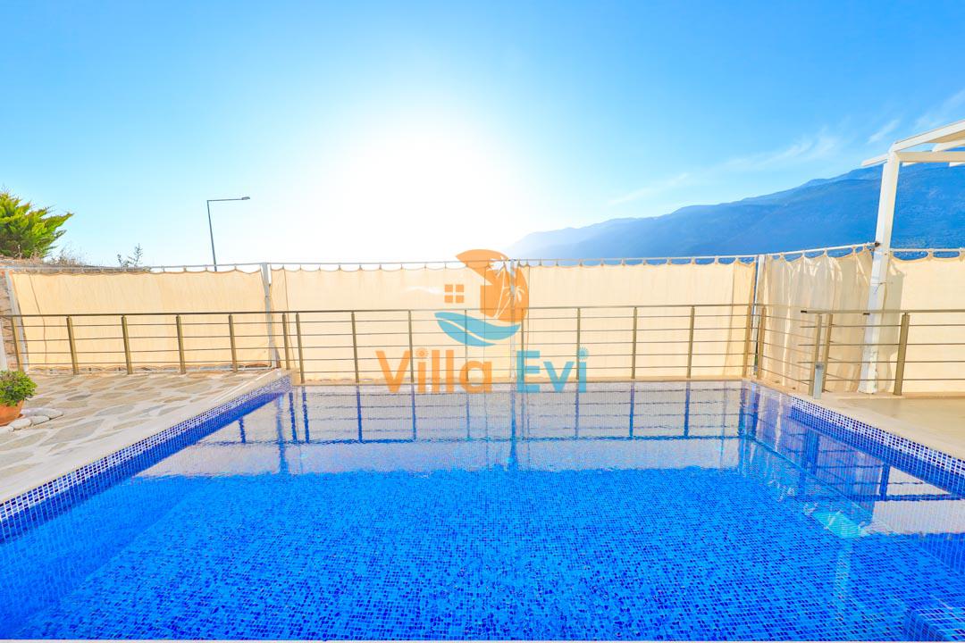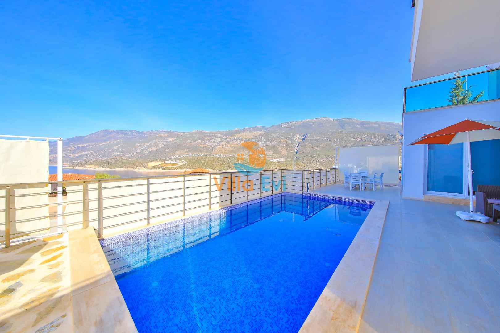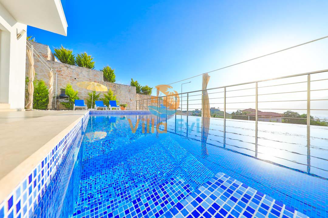 Villa James 3’ün özel havuzu ve geniş terası, deniz manzarası eşliğinde keyifli vakit geçirmenizi sağlar.