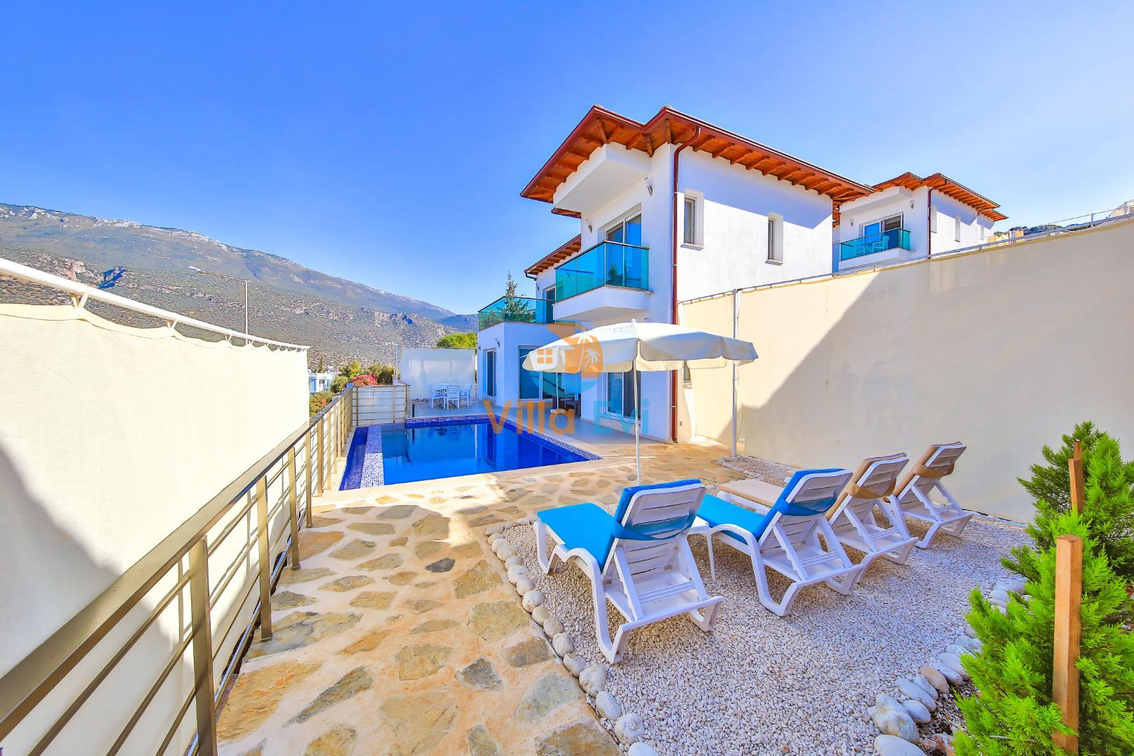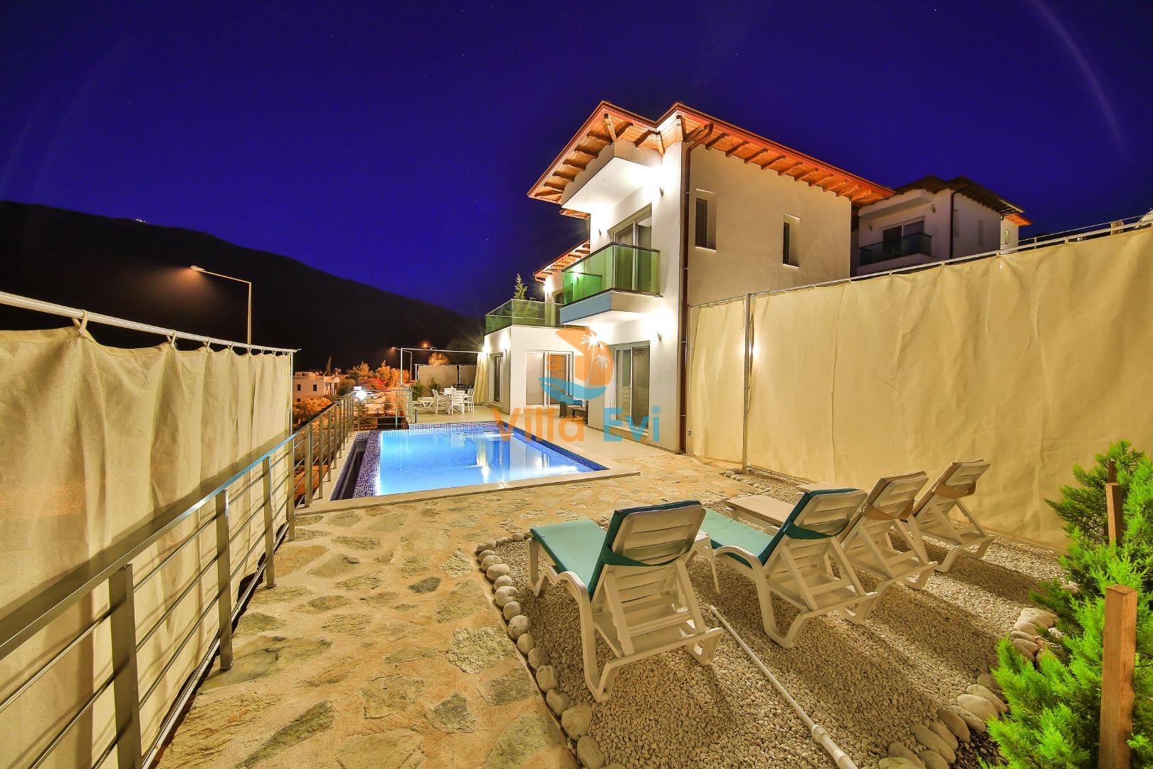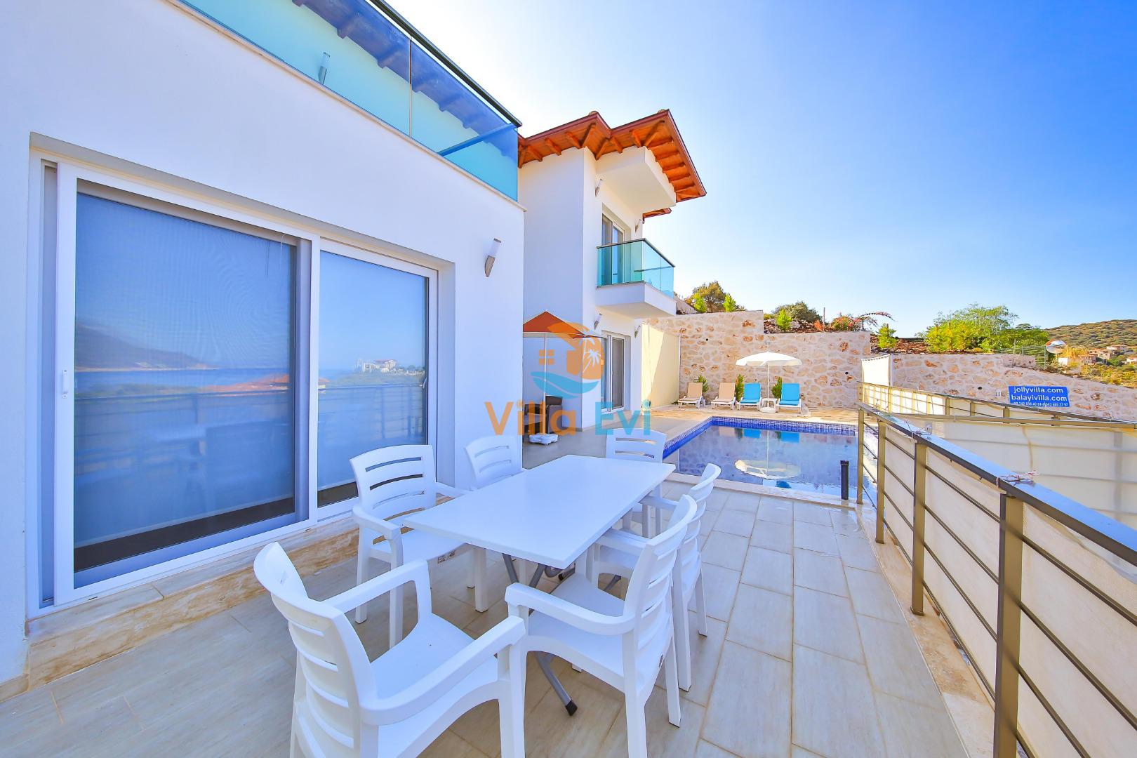 Villa James 3’ün özel havuzu ve geniş terası, deniz manzarası eşliğinde keyifli vakit geçirmenizi sağlar.