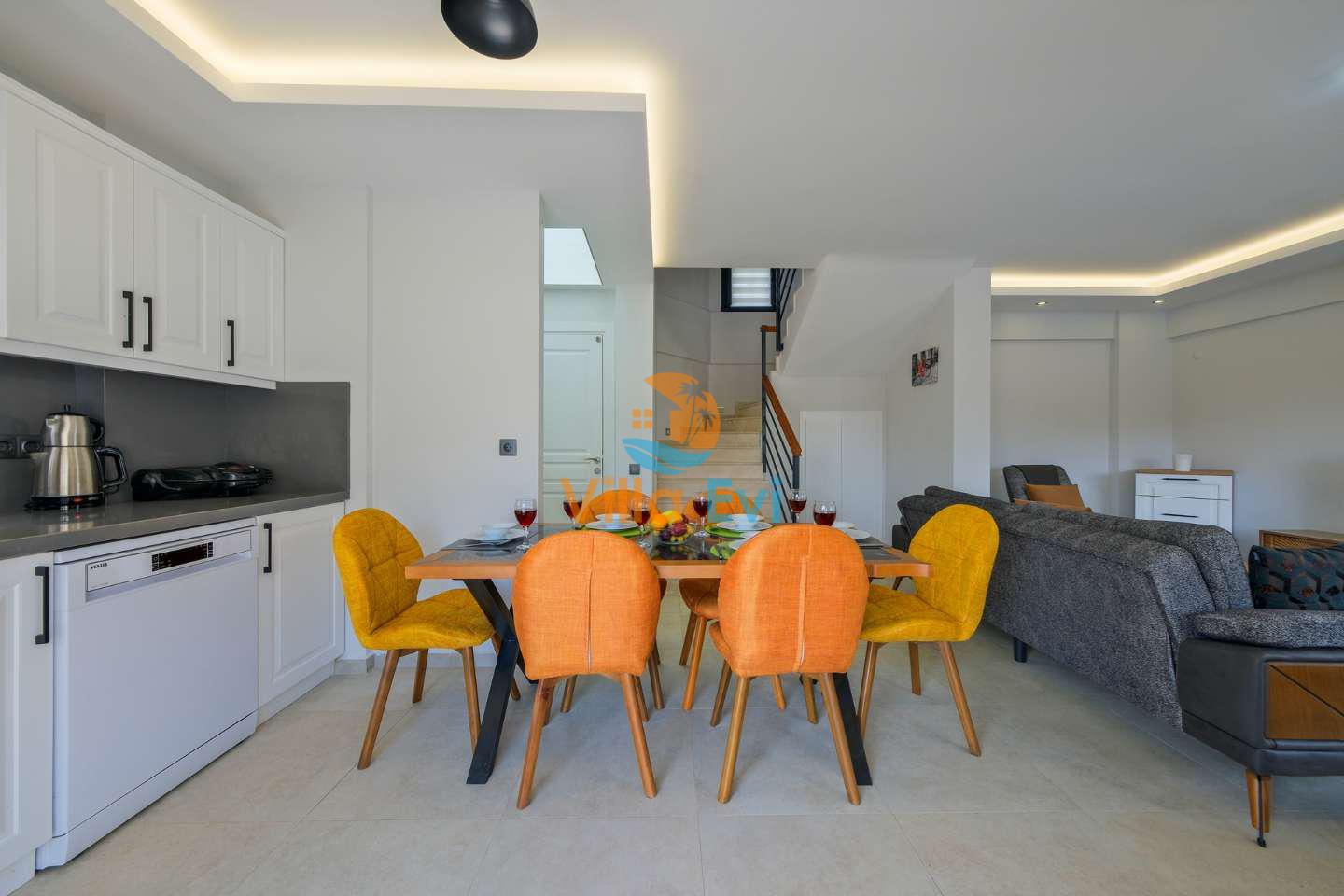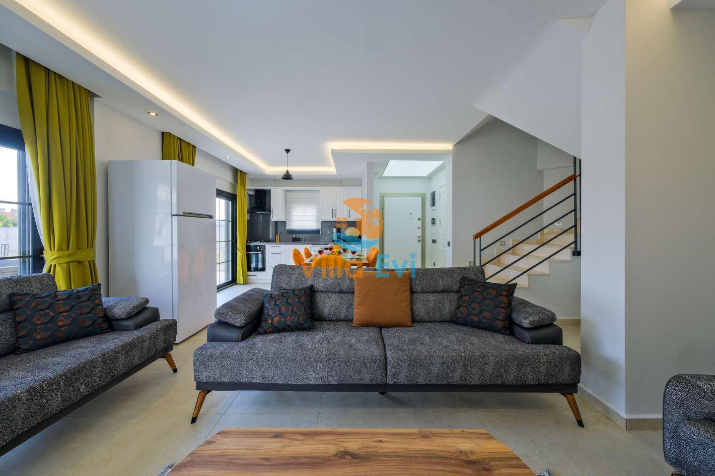 Villanın geniş ve ferah iç mimarisi, kapasiteye uygun modern mobilyalar ile donatılmıştır.