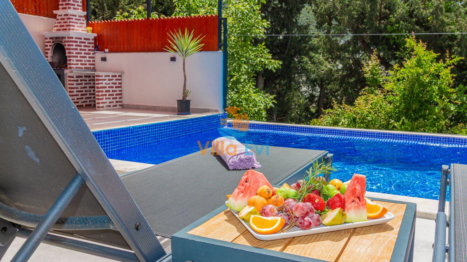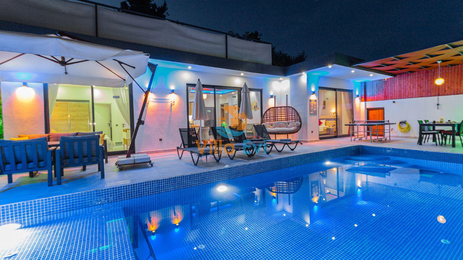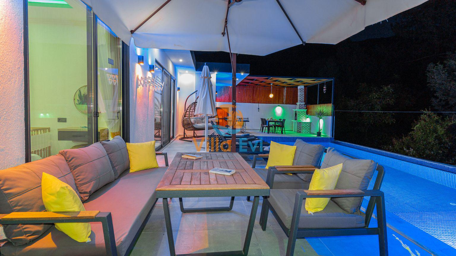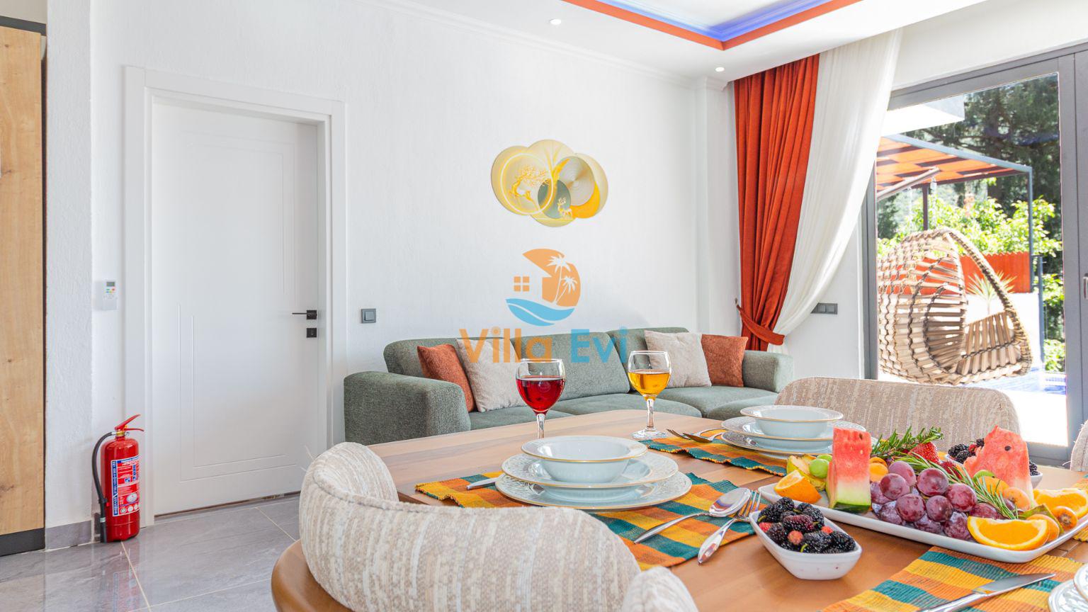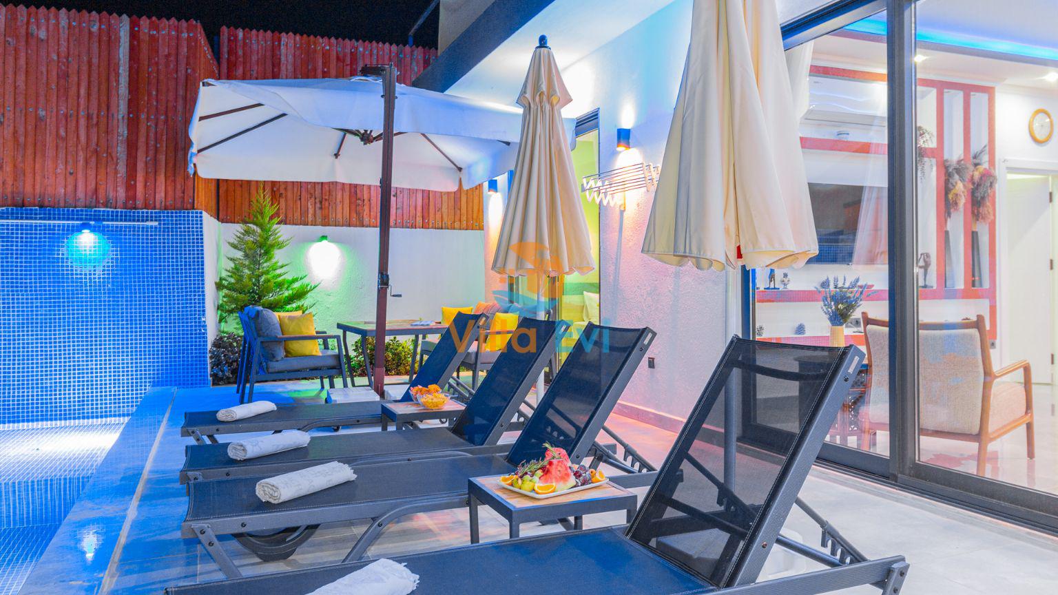 Villamız, modern ve zevkli mobilyalarla dekore edilmiş iç mekanlara sahiptir. Konforunuz için her detayın düşünüldüğü bu şık yaşam alanında, kendinizi evinizde gibi hissedeceksiniz. Villaya ait özel yüzme havuzu, doğa manzarasının eşlik ettiği keyifli anlar geçirmeniz için özenle tasarlanmıştır. Güneşlenme terasında dinlenmek ve Akdeniz güneşiyle enerji depolamak isteyenler için ideal bir kaçış noktasıdır.