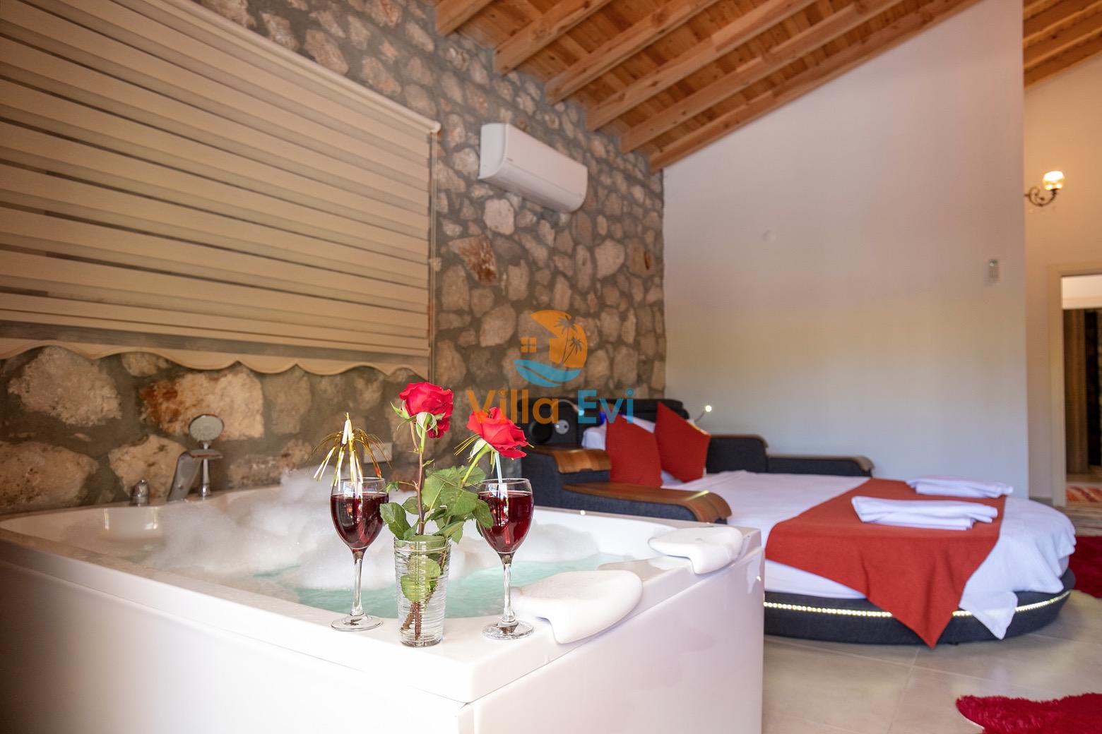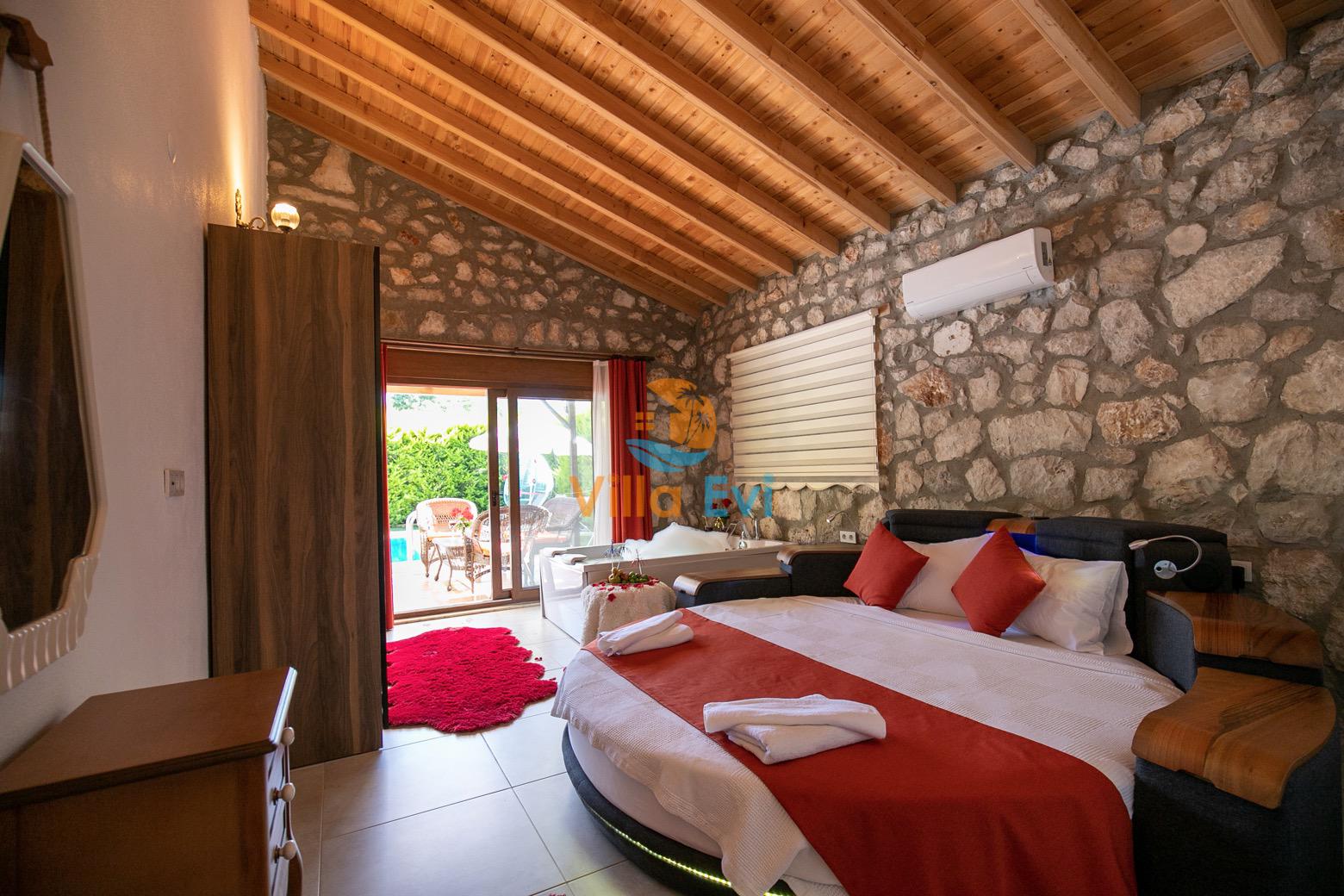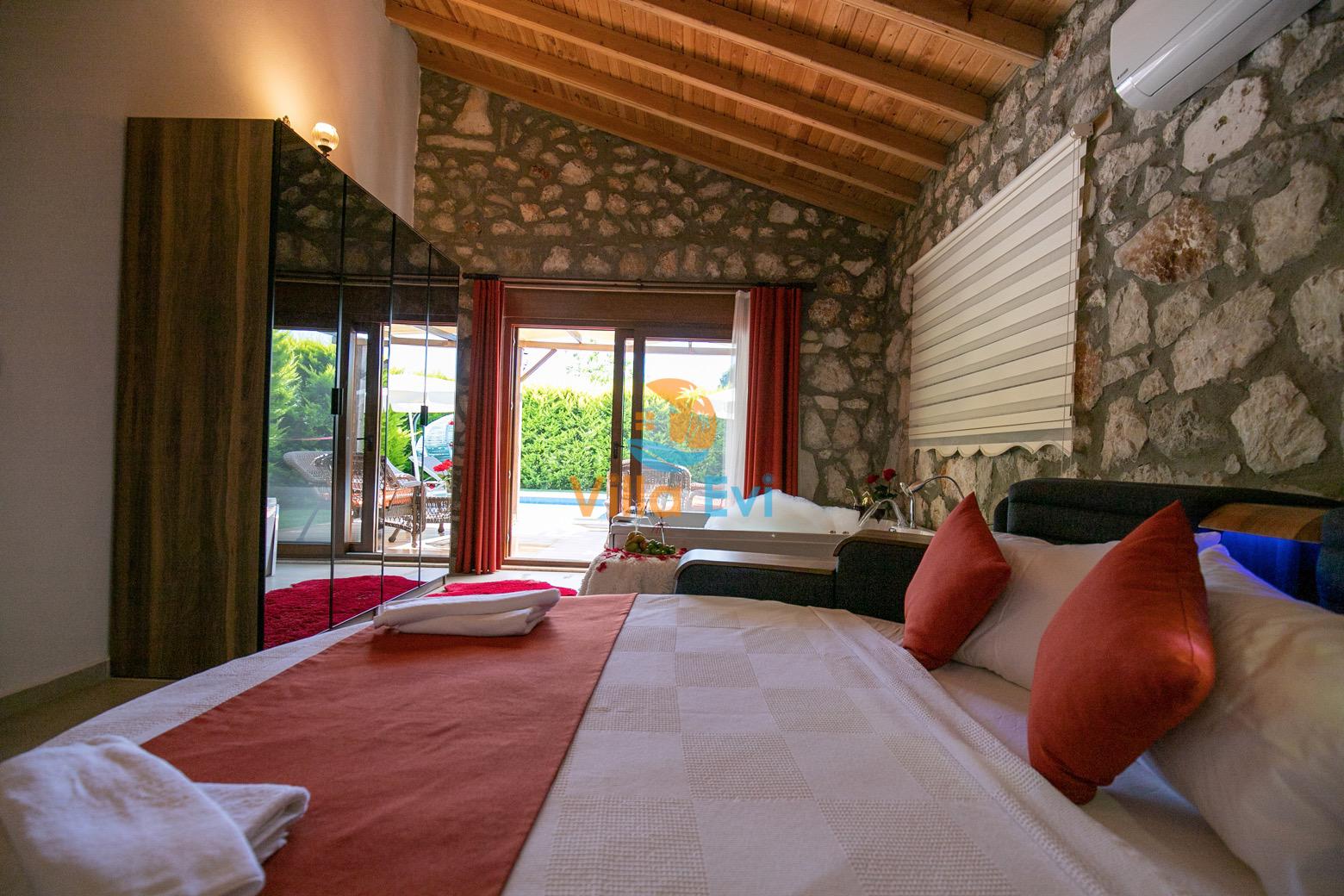 1. Yatak Odası : 1 adet çift kişilik yatak, makyaj masası, klima, elbise dolabı, komodin, Banyo&WC ve Jakuzi bulunmaktadır.