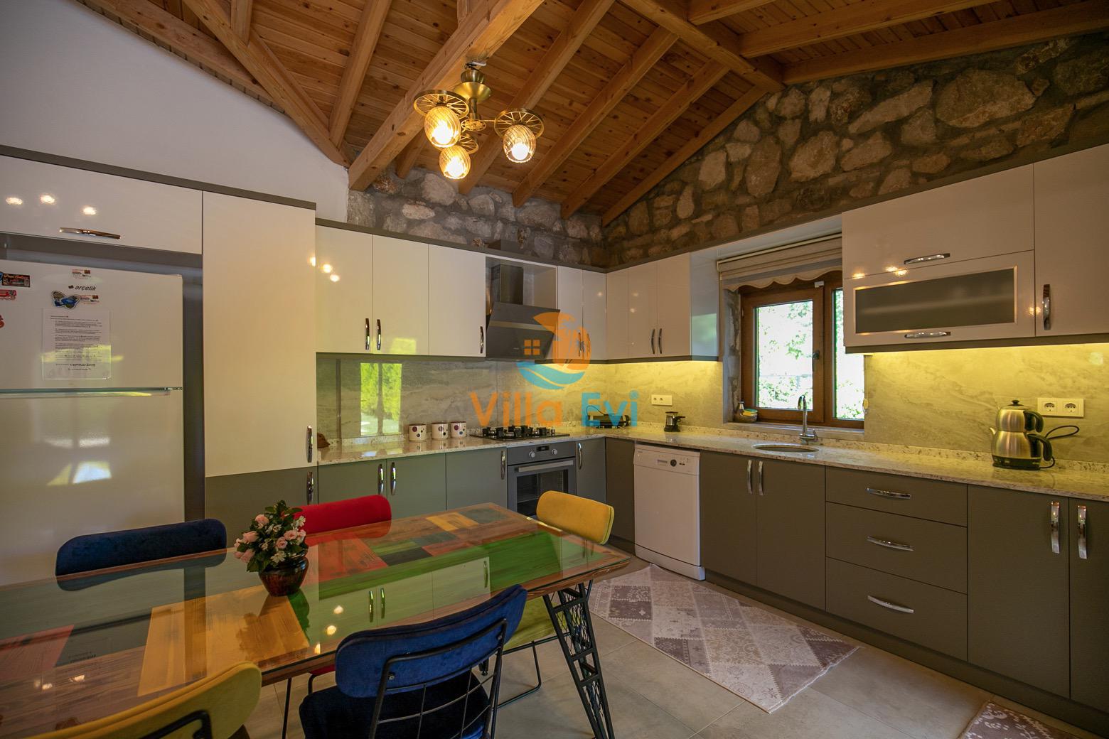 Mutfak : Havuz katında bulunan Amerikan mutfakta buzdolabı, bulaşık makinesi, çamaşır makinesi, yemek masası, fırın, 4’lü ocak, tost makinesi, kettle, yemek takımı, tava, tencereler ve çatal bıçak takımı bulunmaktadır.