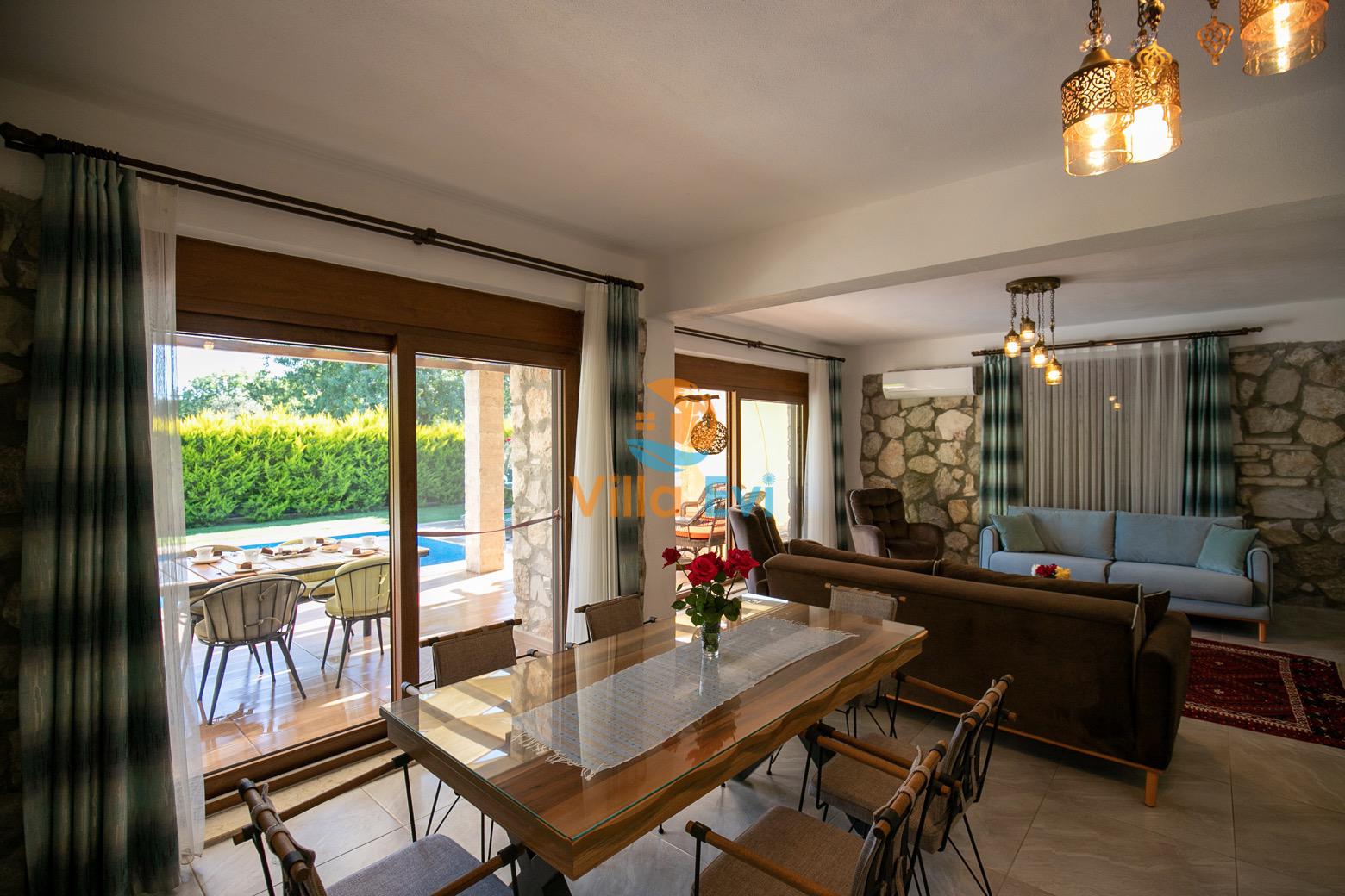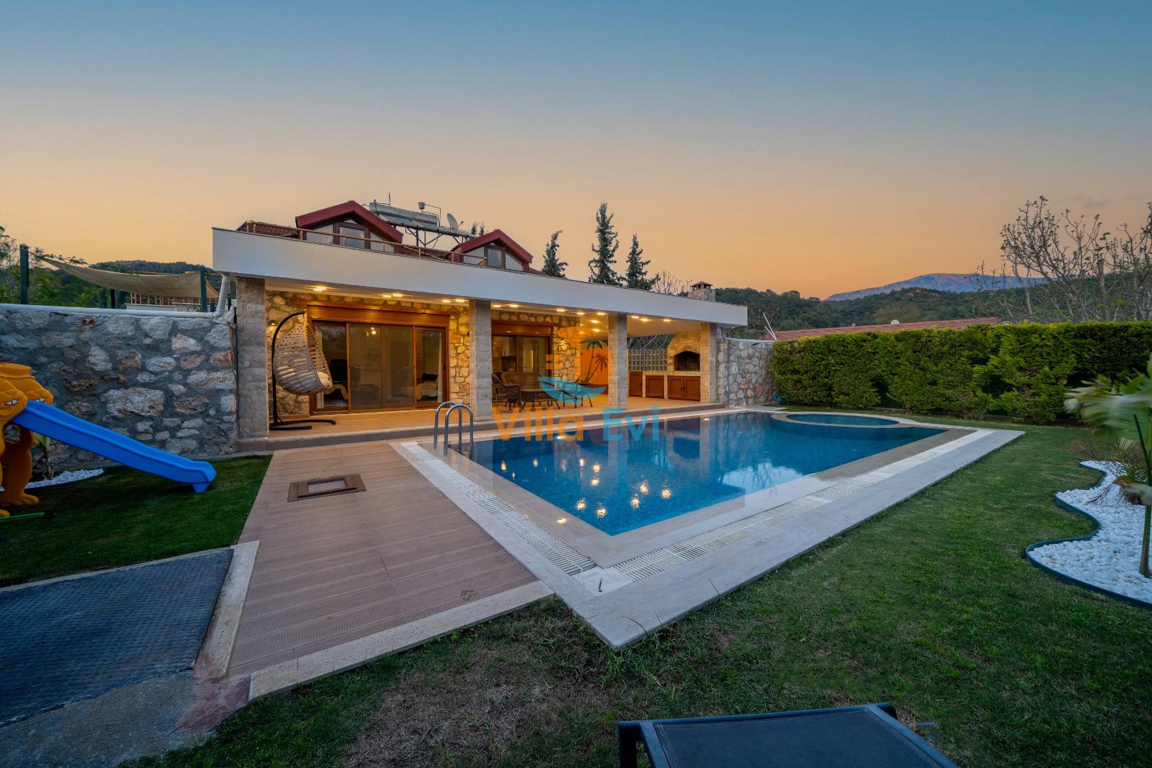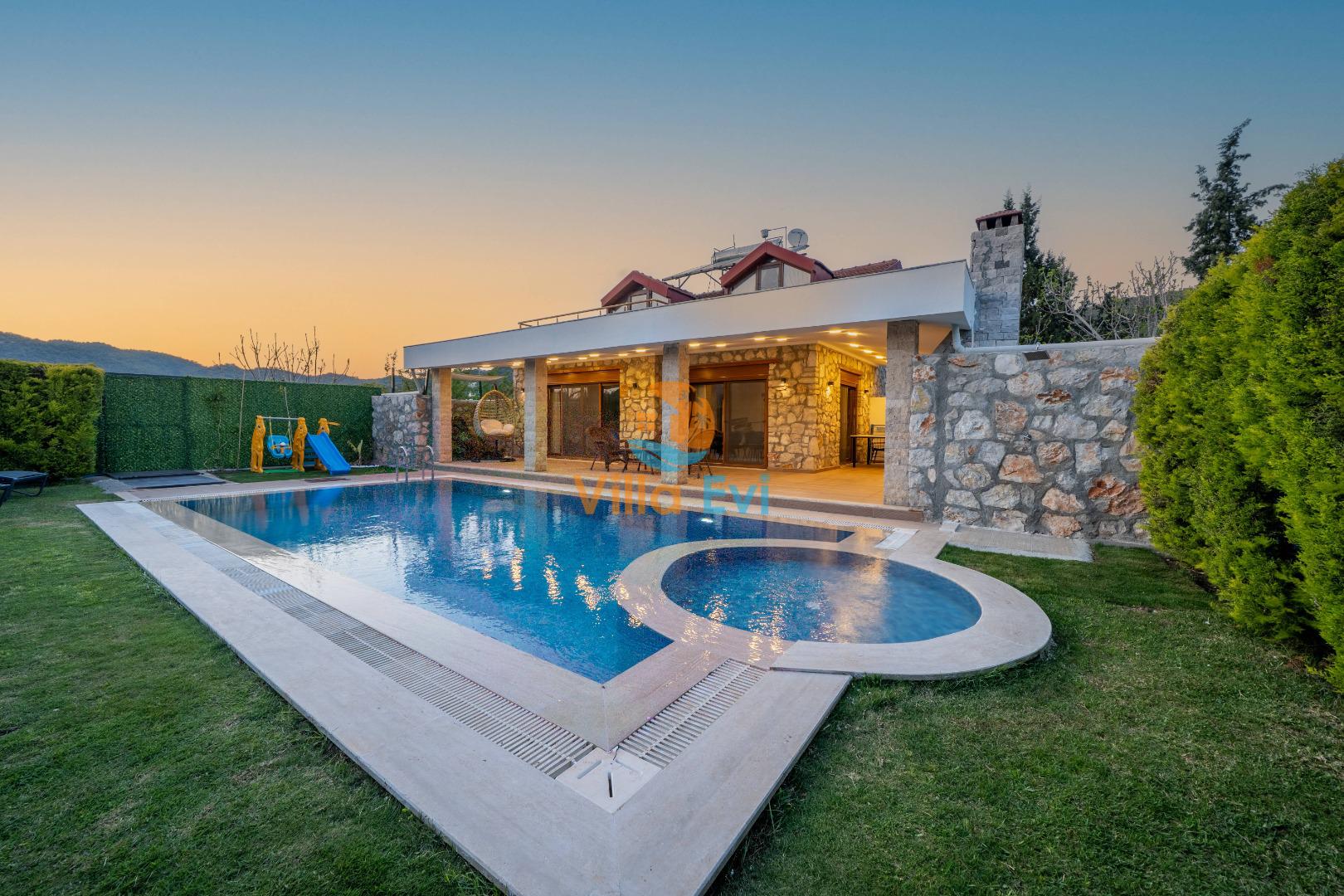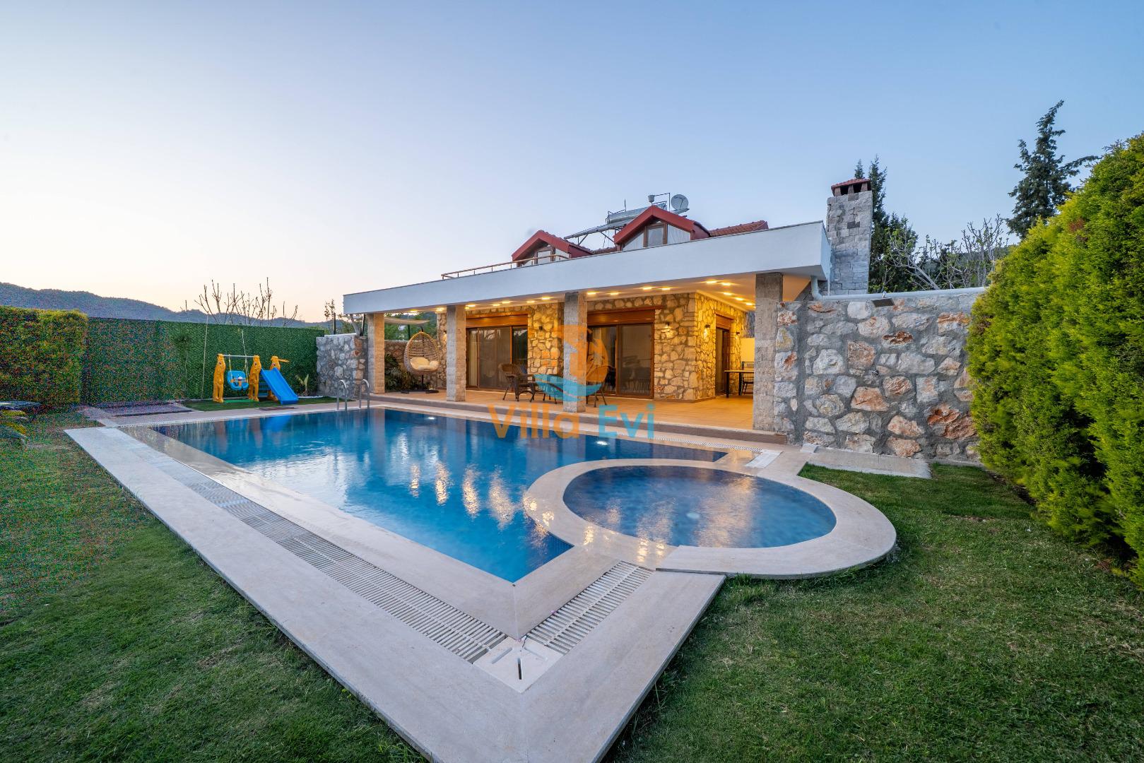 Taş ve ahşabın kusursuz uyumuyla tasarlanan villa, geniş bahçesi, çocuk havuzu, jakuzi ve mevsim şartlarına uygun ekipmanlarıyla keyifli bir tatil deneyimi sunar.