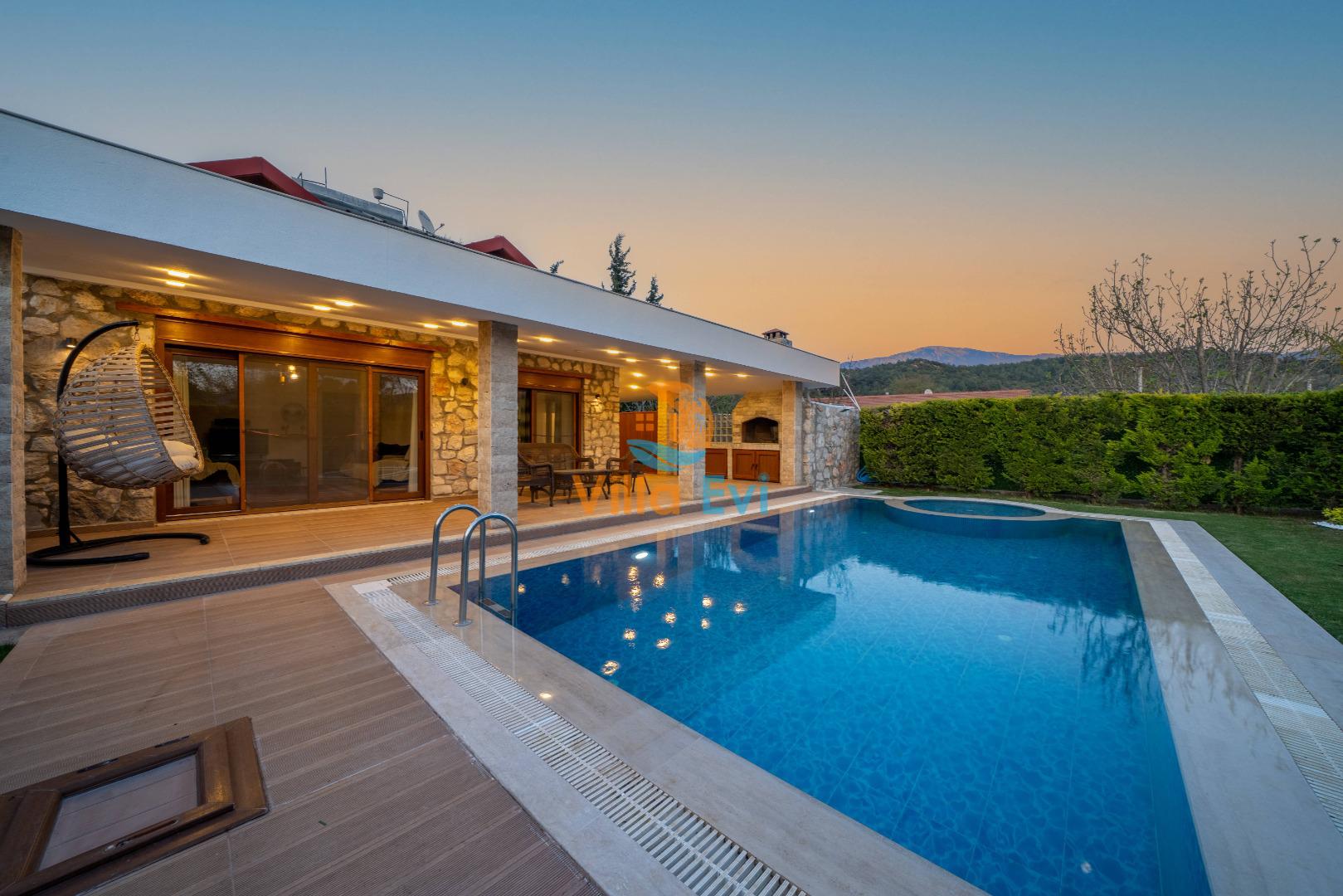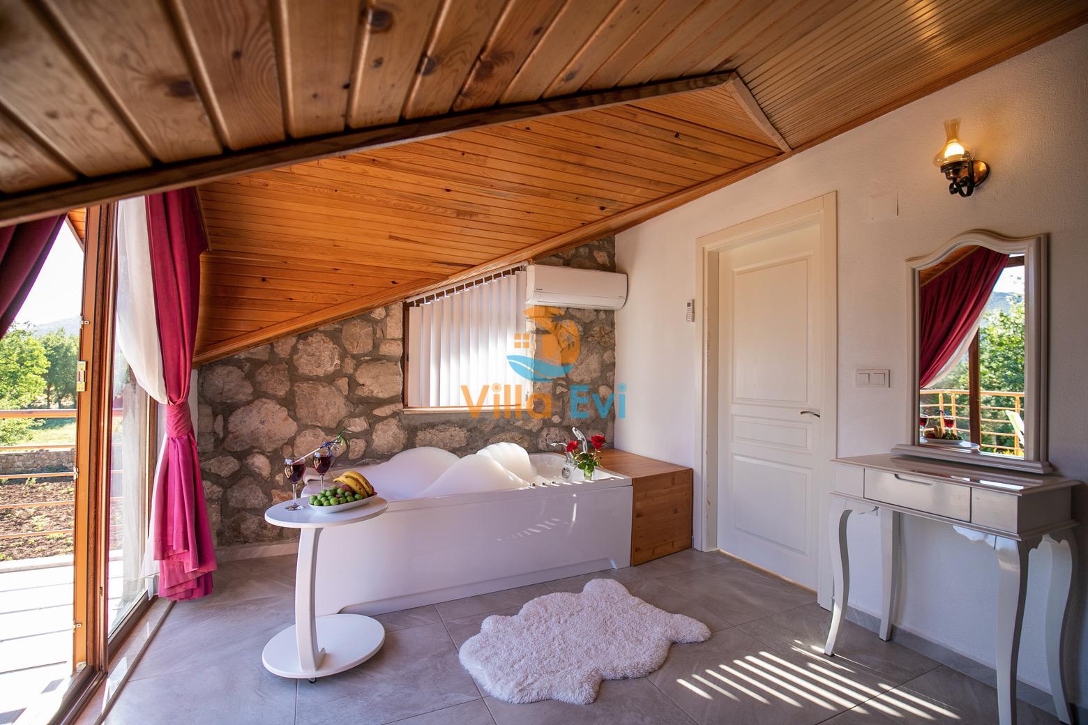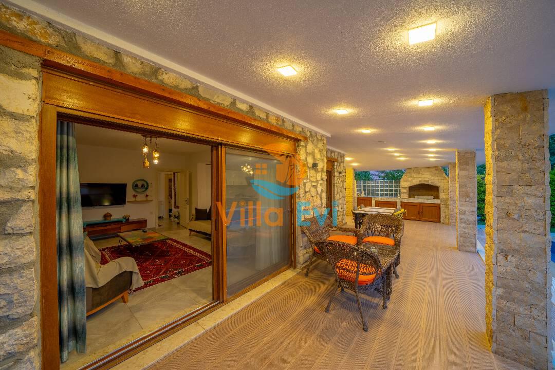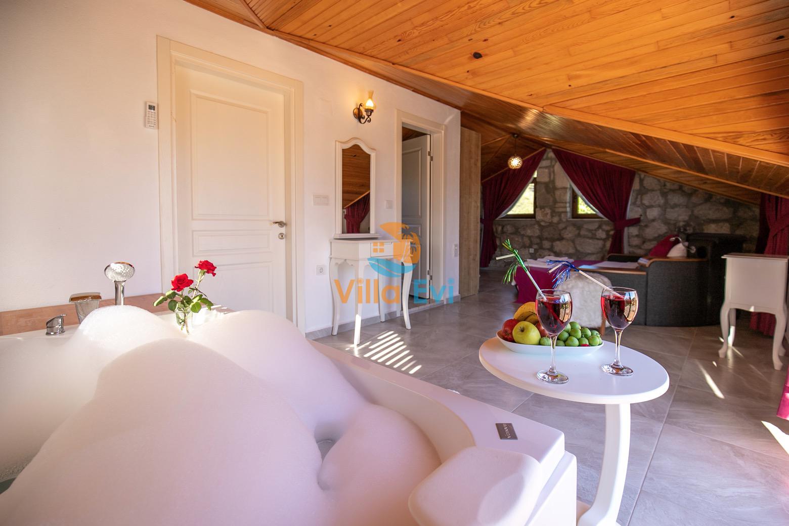 Taş ve ahşabın kusursuz uyumuyla tasarlanan villa, geniş bahçesi, çocuk havuzu, jakuzi ve mevsim şartlarına uygun ekipmanlarıyla keyifli bir tatil deneyimi sunar.