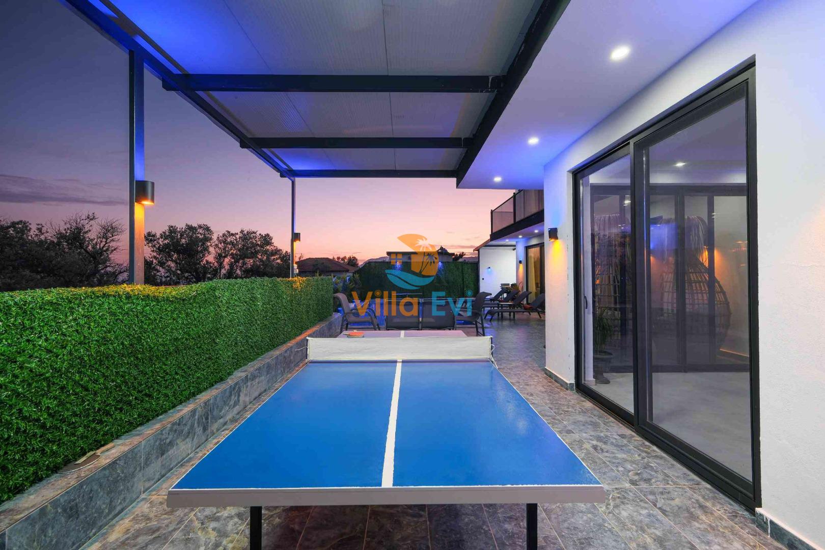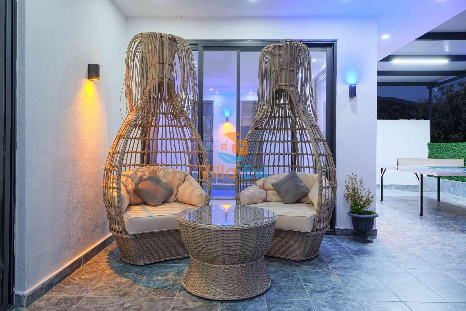 TV, Konforlu oturma grubu, Sehpa ve Ferah yaşam alanı bulunmaktadır. Ev konforunda bir kiralık villa tatili sunar.
