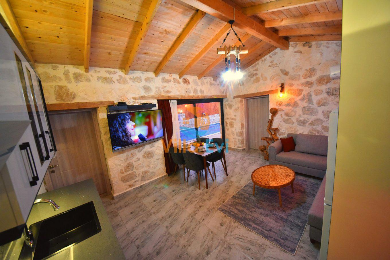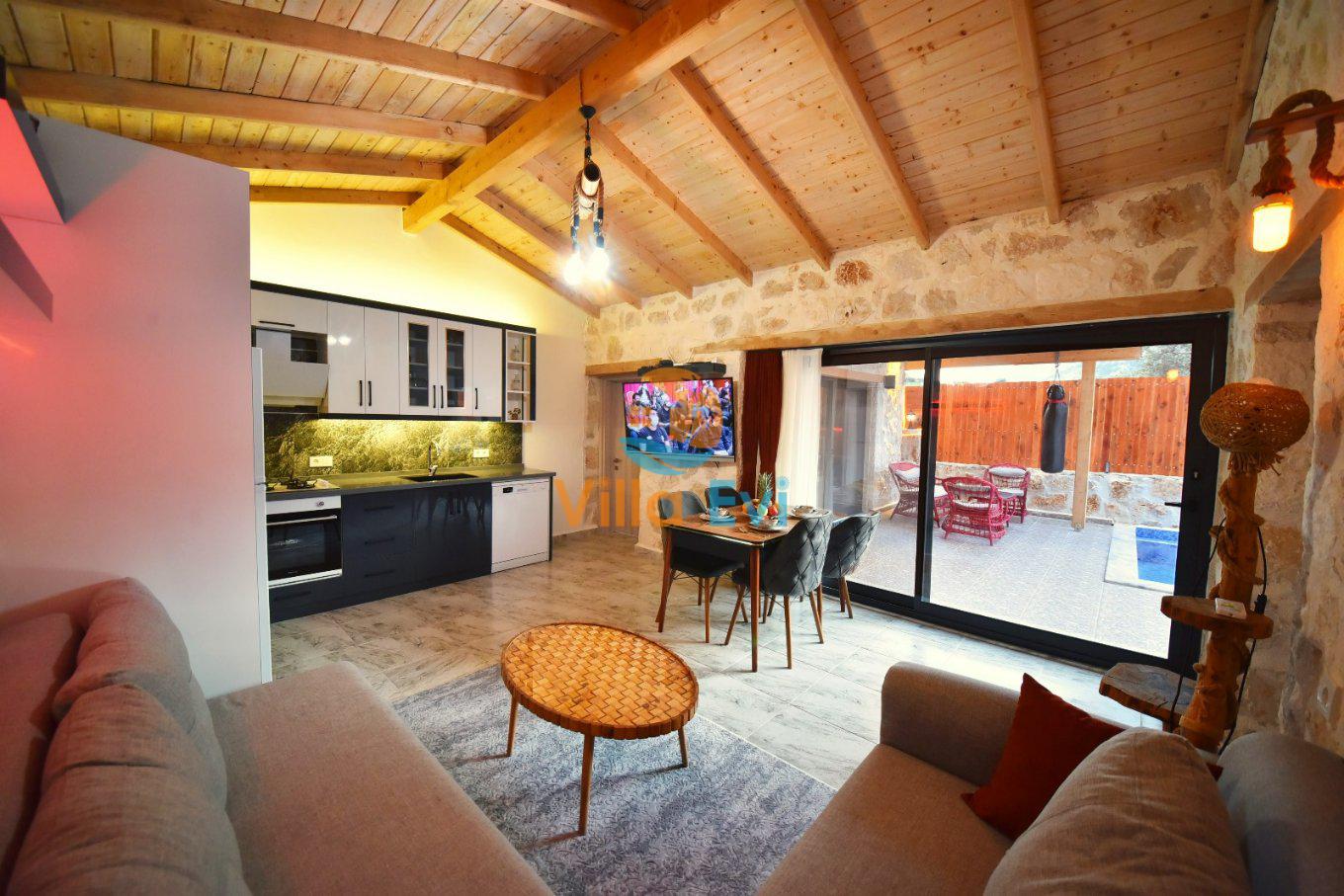 Açık planlı salon ve mutfak alanı, ferah yapısıyla ev konforunu tatilinize taşır. Modern mobilyalar, oturma alanı ve yemek masası ile keyifli vakit geçirebilirsiniz. Bu özellikleriyle Villa Yıldız, villa kiralama tercihinde bulunan misafirler için ideal bir seçenektir.